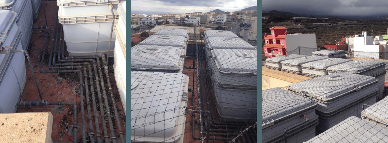 Instalación de redes para impedir a las palomas el acceso a la azotea y la posa. Instalación de cremallera para permitir el acceso a la azotea por parte de tecnicos o propietarios.