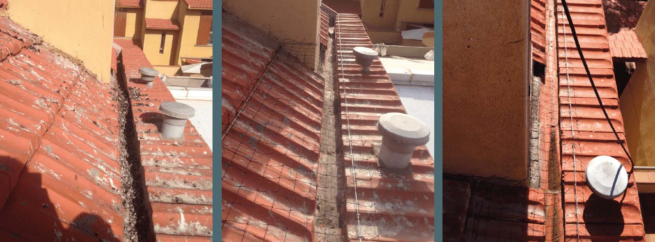 Remoción del guano, limpieza y desinfección del tejado. Instalación de red para impedir a las palomas el acceso al tejado, que utilizaban por nidificar y criar. Instalación de pimchos en el perimetro del tejado para impedir a las palomas de posarse y ensuciar las fachadas y el suelo de abajo..